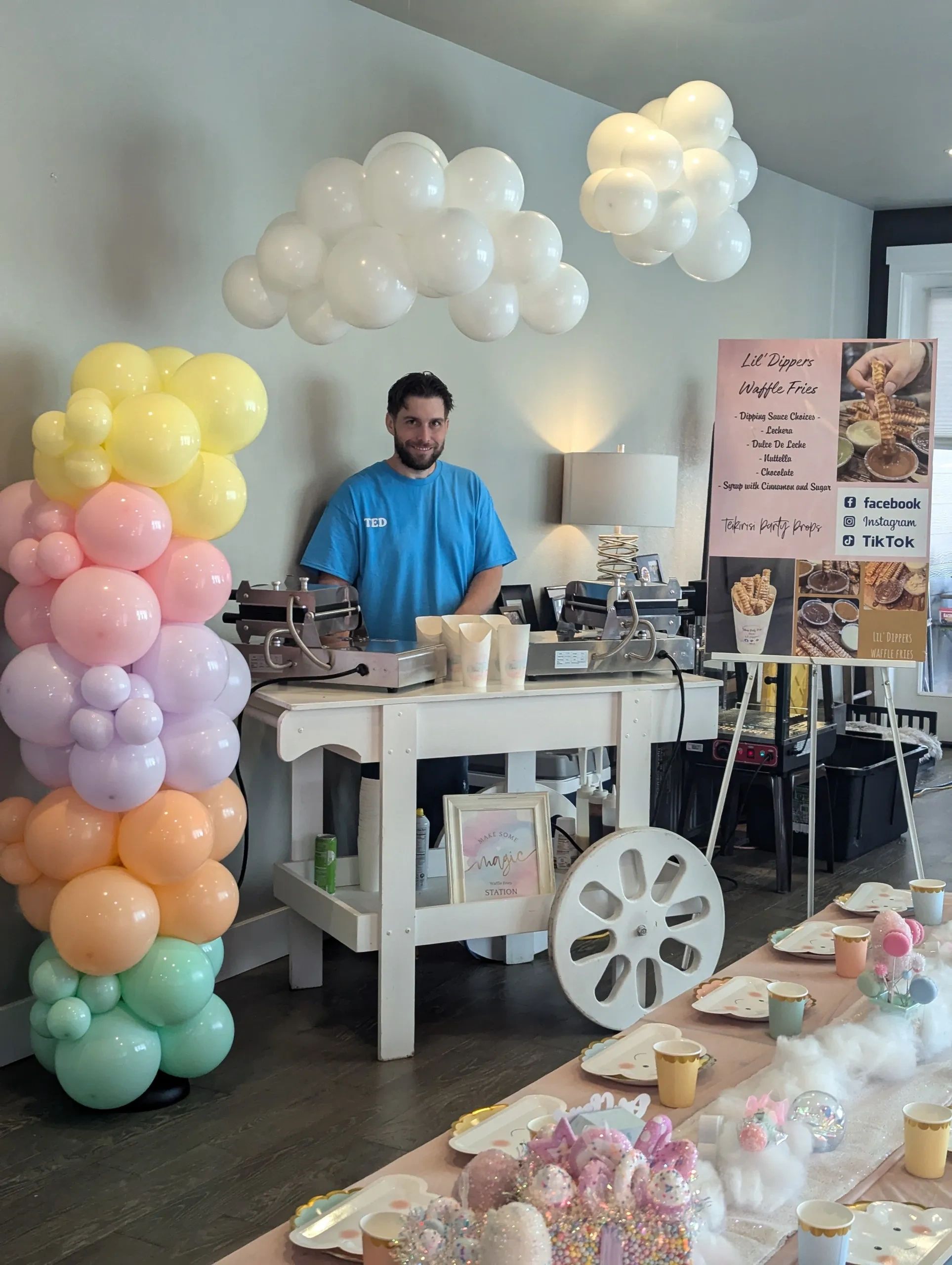 We’re excited to offer a delicious treat selection that includes our Lil' Popsies Waffle Bites and Lil' Dippers Waffle Fries! For a fun twist, we’ll have live cotton candy spinning with all the toppings you can imagine. To complete the experience, we’ll also include a beautiful balloon arrangement, all served from a stylish cart. Perfect for any event!